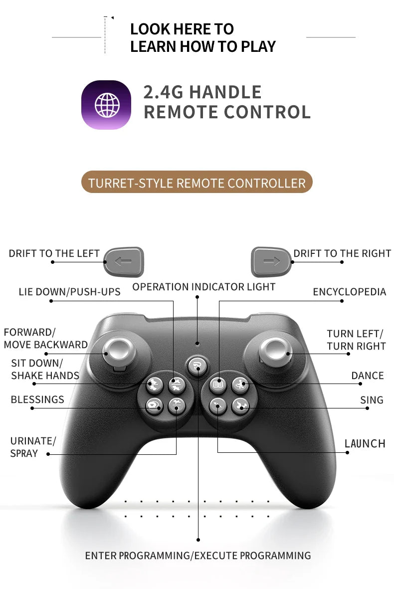 -It can go Forward, backward, pee, auto-act, coquetry, dance. All of actions can be controlled by controller.